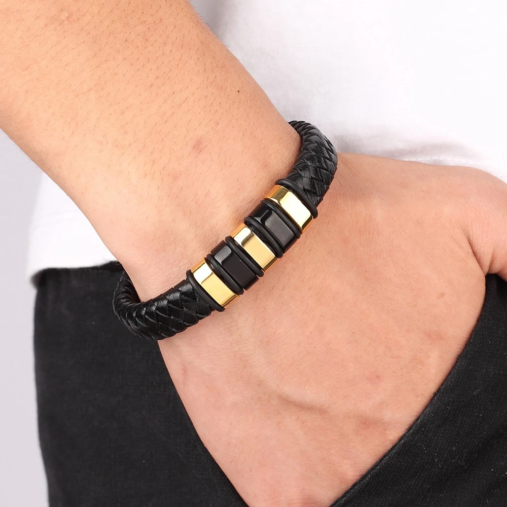 Best XQNI Cool Punk Black Gold Stainless Steel Magnetic Button Design Genuine Leather Bracelet for Men F