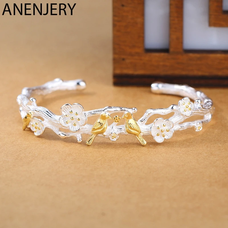 New ANENJERY Fashion Little Bird and Plum Blossom Adjustable Bangle Bracelet 925 Sterling Silver Bangle