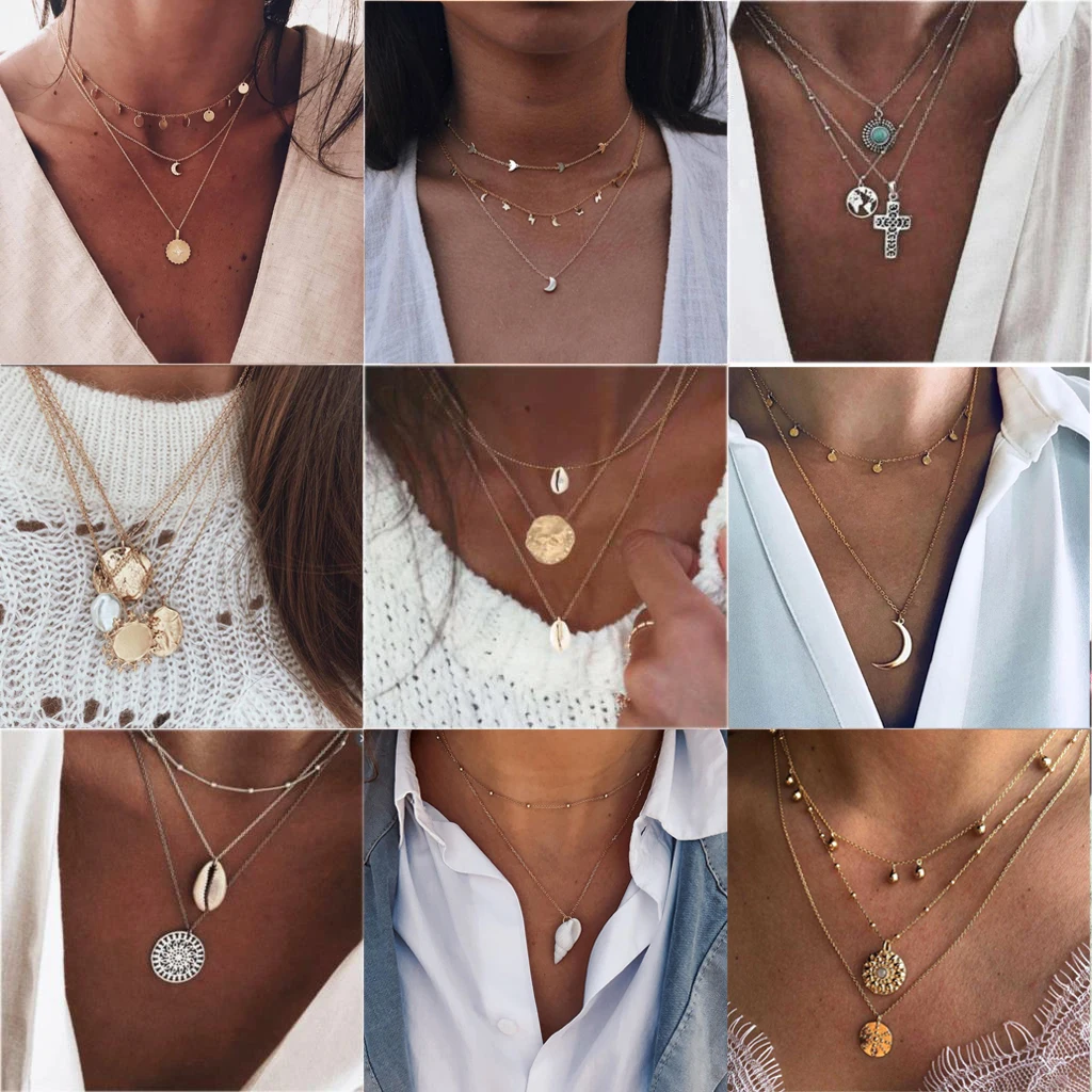 New 26 Styles Bohemian Multi layer Pendant Necklaces For Women Fashion Golden Geometric Charm Chains Ne