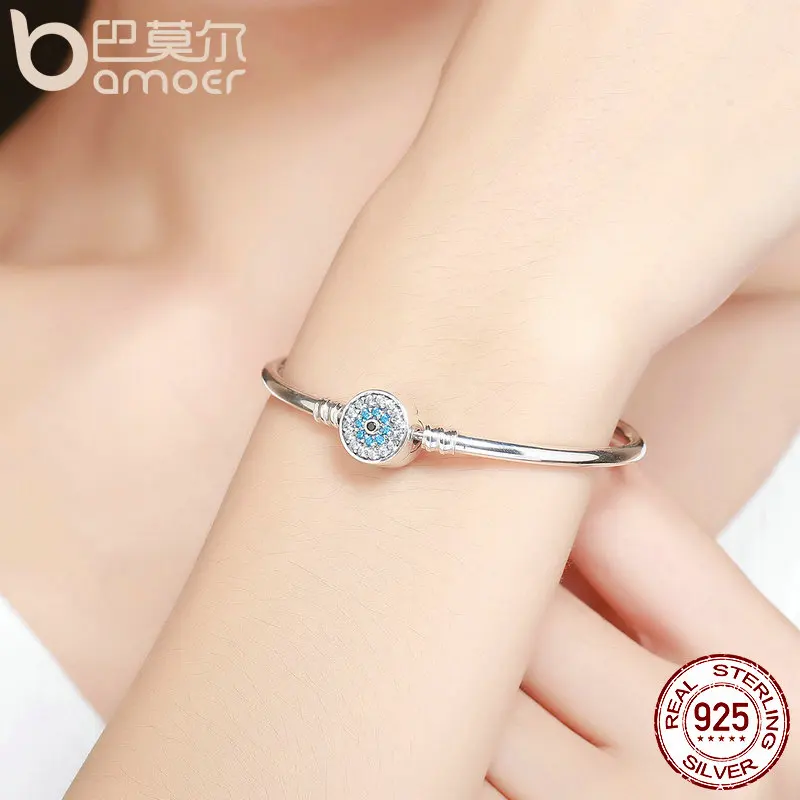 New BAMOER High Quality Authentic 925 Sterling Silver Blue Eyes Clear CZ Snake Chain Heart Bangle & Bra