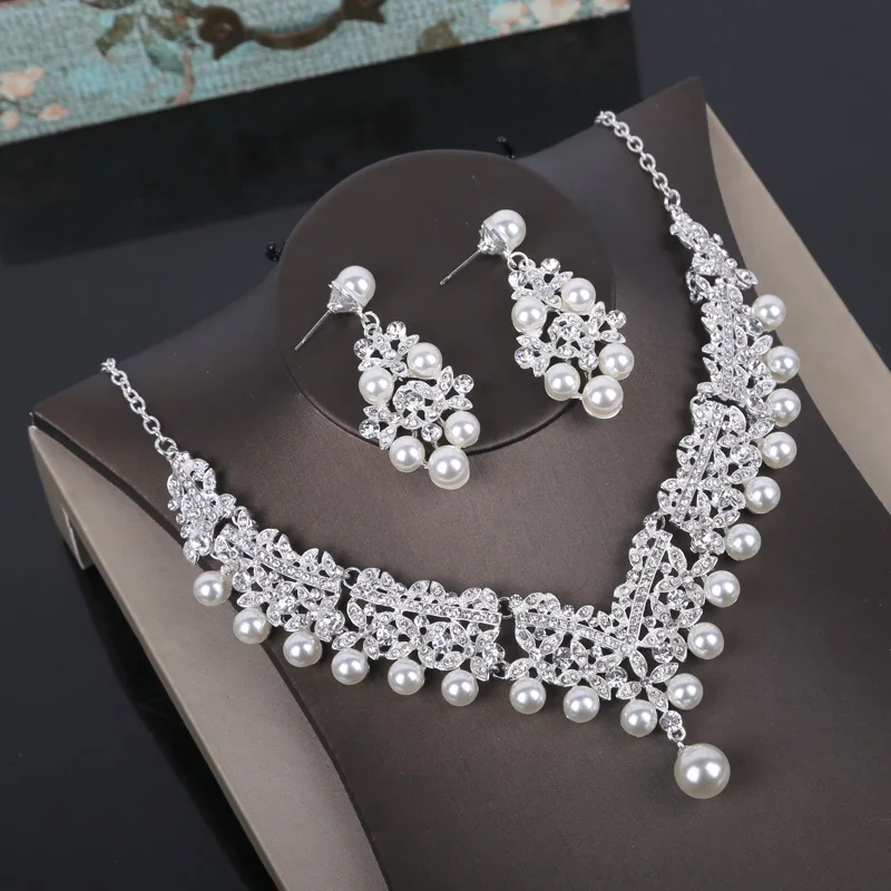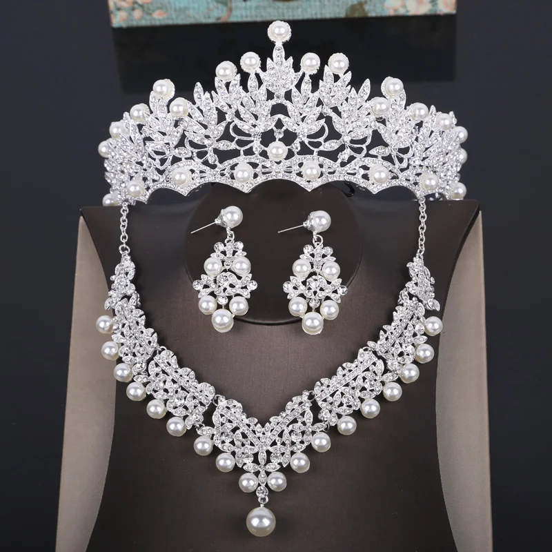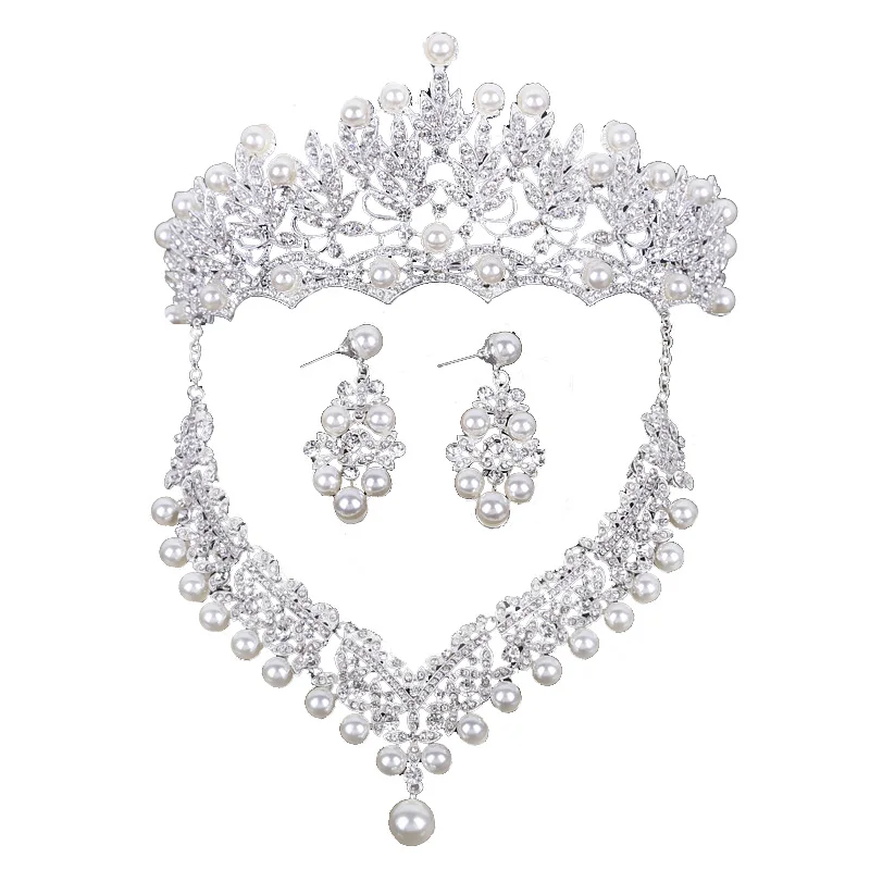 New Fashion Crystal Pearl Costume Jewelry Sets Rhinestone Statement Necklace Earrings Crown Tiaras Set